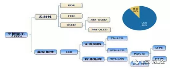 平板显示可以按照技术特点划分为液晶显示(LCD)、有机发光二极管显示(OLED)、等离子显示(PDP)、场发射显示(FED)等。其中,OLED由于生产技术尚未成熟,良率还有很大的提升空间,因此价格较高,目前主要应用在小尺寸显示领域。而LCD依靠其在性价比、分辨率、耗电量以及参数多样化上的显著优势,是目前平板显示领域的主流技术,占据了90%以上的市场份额。